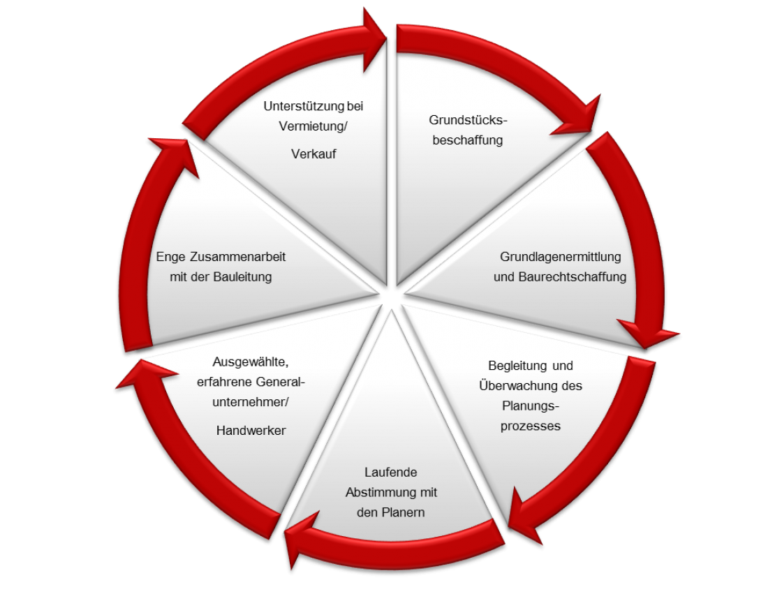 Unterstützung bei Vermietung/Verkauf: Sollten Sie nach Fertigstellung Ihres Objekts dessen Vermietung oder Verkauf nicht alleine in Angriff nehmen wollen, unterstützen wir Sie natürlich auch gerne bei der Suche nach geeigneten Mietern/Käufern.